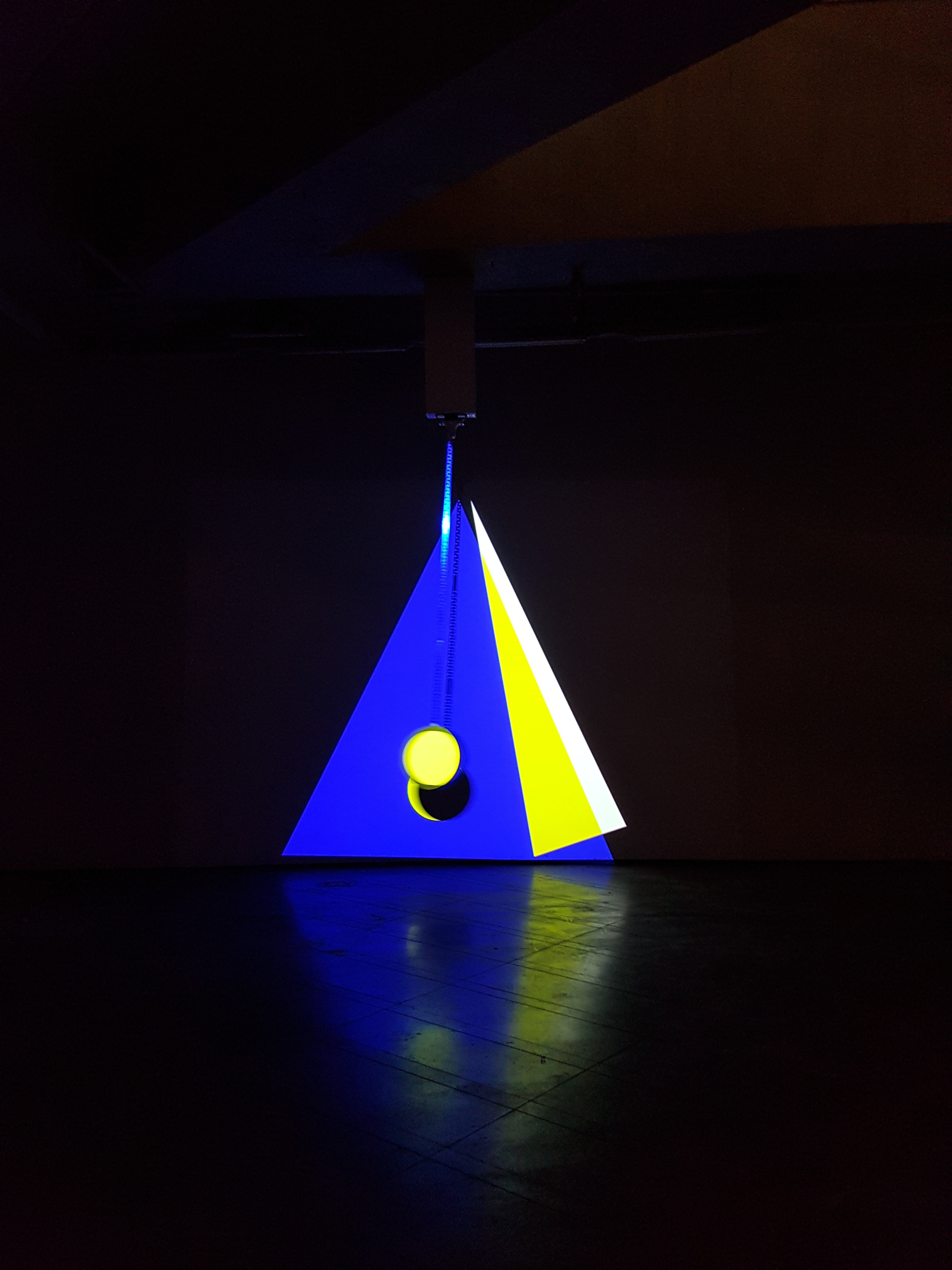 Drawing upon ideas of perception and consciousness and the parallels between environments both digital and physical are explored in the kinetic work Phaseshift, 2016. Created specifically for exhibition at Loop Alternative Space Phaseshift is a suspended two-metre mechanical pendulum attracted by an electromagnet to engage a swinging motion. The pendulum’s movement is echoed by the ticking sound of the internal relay and synchronous projection that spills upon the surface of the pendulum and surrounding wall. Bringing together ideas of time and space, the constant rhythmic pulse of form and projection collide and interact inciting a hypnotic meditative experience for the viewer.