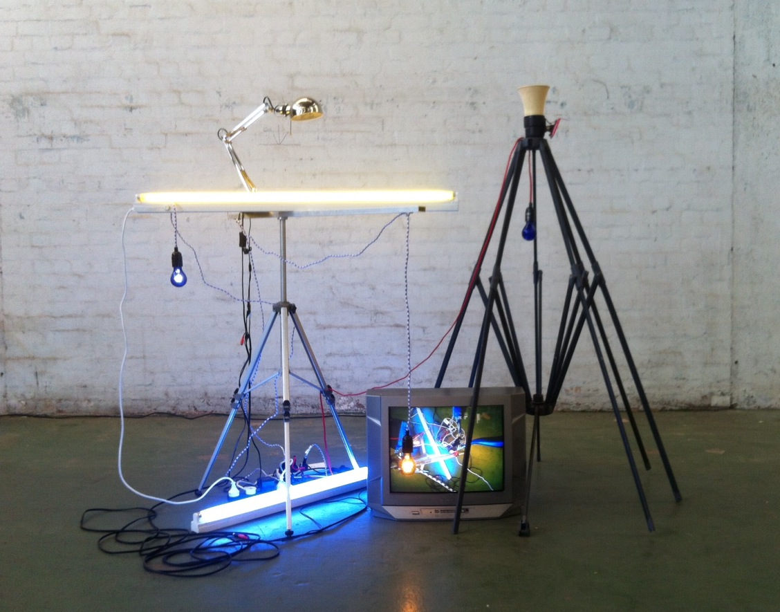 For the exhibition Colourshift Manning has created three new works comprised from ubiquitous materials ranging from LCD televisions, mirrors, video cameras, electric lights, record turntables and horns. Conceptually, these works transverse ideas of technology and language to discourses about the way we represent and manifest identity through the seemingly endless adaptations of communication modes.